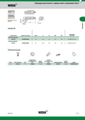 Картриджи Картриджи для пластин с задним углом с креплением типа S Пластины см. на стр. B30-В46. nnSCGP 90° типоразмер номер заказа номер по каталогу D min F L1 λS° γO° пластины правое исполнение 3871270 SCGPR08CA06 25 10,0 32 0.0 0.0 CP..0602../CP..215. левое исполнение 3871271 SCGPL08CA06 25 10,0 32 0.0 0.0 CP..0602../CP..215. nnКомплектующие радиальный осевой регулировочный шести- регулировочный шести- D min винт пластины Torx винт гранник винт крепежный винт гранник шайба 25 MS1153 T7 KUAM34 1.5 мм KUAM20 MS2175 2.5 мм CSWM 040 050 widia.com C111