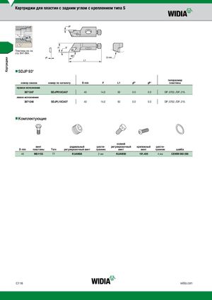 Картриджи Картриджи для пластин с задним углом с креплением типа S Пластины см. на стр. B47-В64. nnSDJP 93° типоразмер номер заказа номер по каталогу D min F L1 γF° γP° пластины правое исполнение 3871247 SDJPR10CA07 40 14,0 50 0.0 0.0 DP..0702../DP..215. левое исполнение 3871248 SDJPL10CA07 40 14,0 50 0.0 0.0 DP..0702../DP..215. nnКомплектующие осевой винт радиальный шести- регулировочный крепежный шести- D min пластины Torx регулировочный винт гранник винт винт гранник шайба 40 MS1153 T7 KUAM28 2 мм KUAM30 191.405 4 мм CSWM 060 050 C118 widia.com