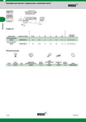 Картриджи Картриджи для пластин с задним углом с креплением типа S Пластины см. на стр. B68-В80. nnSSRC 75° типоразмер номер заказа номер по каталогу D min F FA L1 λS° γO° пластины правое исполнение 3870390 SSRCR12CA12 50 20,0 3,1 55 -3.0 0.0 SC..1204../SC..43. левое исполнение 3870391 SSRCL12CA12 50 20,0 3,1 55 -3.0 0.0 SC..1204../SC..43. nnКомплектующие осевой винт радиальный шести- регулировочный крепежный шести- D min пластины Torx регулировочный винт гранник винт винт гранник шайба 50 MS1157 T15 KUAM23 2.5 мм KUAM31 191.406 4 мм CSWM 060 050 C122 widia.com