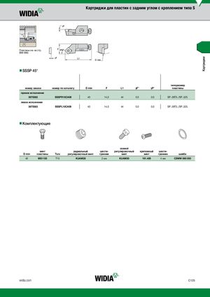 Картриджи Картриджи для пластин с задним углом с креплением типа S Пластины см. на стр. B68-В80. nnSSSP 45° типоразмер номер заказа номер по каталогу D min F L1 γF° γP° пластины правое исполнение 3870382 SSSPR10CA09 40 14,0 44 0.0 0.0 SP..09T3../SP..325. левое исполнение 3870383 SSSPL10CA09 40 14,0 44 0.0 0.0 SP..09T3../SP..325. nnКомплектующие осевой винт радиальный шести- регулировочный крепежный шести- D min пластины Torx регулировочный винт гранник винт винт гранник шайба 40 MS1155 T15 KUAM28 2 мм KUAM30 191.405 4 мм CSWM 060 050 widia.com C125