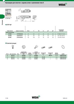 Картриджи Картриджи для пластин с задним углом с креплением типа S Пластины см. на стр. B81-В93. nnSTTP 60° типоразмер номер заказа номер по каталогу D min F FA L1 γF° γP° пластины правое исполнение 3870369 STTPR08CA09 25 6,0 4,3 32 0.0 0.0 TP..0902../TP..1815. 3870368 STTPR10CA11 40 9,0 4,9 50 0.0 0.0 TP..1102../TP..215. 3870367 STTPR12CA16 50 13,0 7,2 55 0.0 0.0 TP..16T3../TP..325. nnКомплектующие радиальный осевой регулировочный шести- регулировочный крепежный крепежный шести- D min винт пластины Torx винт гранник винт винт винт гранник шайба 25 MS1152 T7 KUAM34 1.5 мм KUAM20 — MS2175 2.5 мм CSWM 040 050 40 MS1153 T7 KUAM28 2 мм KUAM30 191.405 — 4 мм CSWM 060 050 50 MS1155 T15 KUAM23 2.5 мм KUAM31 191.406 — 4 мм CSWM 060 050 C128 widia.com