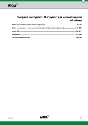Токарный инструмент • Инструмент для мелкоразмерной обработки Обзор решений для мелкоразмерной обработки........................................................................................ D2–D5 Расточные оправки со сменными пластинами для отверстий малого диаметра................................ D6–D59 Серия A/B......................................................................................................................................................... D60–D71 Quadralock........................................................................................................................................................ D72–D84 Техническая информация............................................................................................................................. D86–D89 widia.com D1