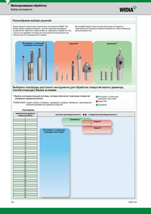 Мелкоразмерная обработка Выбор инструмента Разнообразие выбора решений Среди широкого ассортимента расточных инструментов WIDIA™ Вы Мы разрабатываем только лучшие расточные инструменты, всегда найдете надежный вариант, соответствующий всем Вашим гарантирующие сокращение времени обработки и обеспечивающие потребностям. Какое бы отверстие Вам ни требовалось обработать, Вы высокие результаты. с легкостью подберете оптимальное инструментальное решение при помощи простого руководства по выбору. Инструмент со сменными Серии A/B Quadralock™ режущими пластинами Выберите платформу расточного инструмента для обработки отверстий малого диаметра, соответствующую Вашим условиям 1 Выбор инструментальной системы, которая обеспечит получение отверстия Инструмент со сменными требуемого диаметра (Dmin). режущими пластинами Серия A/B ПРИМЕЧАНИЕ: С ледует выбрать платформу, подходящую под Ваши требования, с максимальным значением минимального диаметра отверстия. Quadralock Растачивание минимальный диаметротверстия (Dmin) высокая производительность стандартная производительность 1 2 Quadralock™ 3 Серия A 4 5 Серия B 6 Инструмент со сменными 7 режущими пластинами 8 9 10 11 12 13 14 15 16 17 18 19 20 21 22 23 24 25 26 27 28 29 30 31 32 33 34 35 D2 widia.com