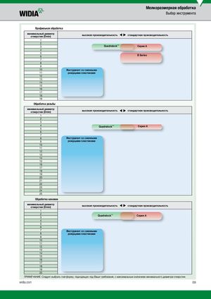 Мелкоразмерная обработка Выбор инструмента Профильная обработка минимальный диаметротверстия (Dmin) высокая производительность стандартная производительность 1 2 3 Quadralock™ Серия A 4 5 6 B Series 7 8 9 10 Инструмент со сменными 11 режущими пластинами 12 13 14 15 16 17 18 19 Обработка резьбы минимальный диаметротверстия (Dmin) высокая производительность стандартная производительность 1 2 3 4 Quadralock™ Серия A 5 6 7 8 Инструмент со сменными 9 режущими пластинами 10 11 12 13 14 15 16 17 18 19 20 21 22 23 24 25 Обработка канавок минимальный диаметротверстия (Dmin) высокая производительность стандартная производительность 1 23 Quadralock™ Серия A 4 5 6 7 Инструмент со сменными 8 режущими пластинами 9 10 11 12 13 14 15 16 17 18 19 20 ПРИМЕЧАНИЕ: Следует выбрать платформу, подходящую под Ваши требования, с максимальным значением минимального диаметра отверстия. widia.com D3