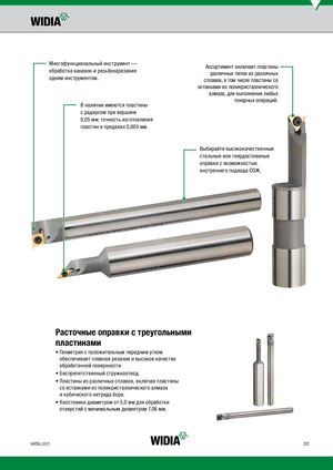 Многофункциональный инструмент —обработка канавок и резьбонарезаниеАссортимент включает пластиныразличных типов из различных одним инструментом. сплавов, в том числе пластины со вставками из поликристаллического алмаза, для выполнения любых токарных операций. В наличии имеются пластины с радиусом при вершине 0,05 мм; точность изготовления пластин в пределах 0,005 мм. Выбирайте высококачественные стальные или твердосплавные оправки с возможностью внутреннего подвода СОЖ. Расточные оправки с треугольными пластинами • Геометрия с положительным передним углом обеспечивает плавное резание и высокое качество обработанной поверхности. • Беспрепятственный стружкоотвод. • Пластины из различных сплавов, включая пластины со вставками из поликристаллического алмаза и кубического нитрида бора. • Хвостовики диаметром от 5,0 мм для обработки отверстий с минимальным диаметром 7,06 мм. widia.com D7
