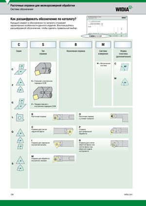 Расточные оправки для мелкоразмерной обработки Система обозначения Как расшифровать обозначение по каталогу? Каждый символ в обозначении по каталогу отражает характерные особенности данного изделия. Воспользуйтесь расшифровкой обозначения, чтобы сделать правильный выбор. CSBM5210125R C S B M Серия Тип Назначение оправки Система Форма оправки измерения пластины (дополнительно) M = М етрическая C система C W S = С тальная с внутренним подводом СОЖ F G C = Т вердосплавная с внутренним подводом СОЖ B O L Расточная оправка Расточная оправкас угловой головкой C P Оправка для снятия Оправка Q наружной фаски для профильной обработки I R Оправка для нарезания Оправка для снятия внутренней резьбы обратной фаски или снятия фаски при обратной подаче инструмента M Оправка для обработки внутренних канавок S D8 widia.com