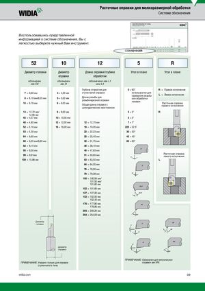 Расточные оправки для мелкоразмерной обработки Система обозначения Воспользовавшись представленной информацией о системе обозначения, Вы с легкостью выберете нужный Вам инструмент. CSBM5210125R 52 10 12 5 R Диаметр головки Диаметр Длина оправки/глубина Угол в плане Угол в плане оправки обработки обозначен обозначен обозначено как L1 как D2 как D или L4 Глубина отверстия для 0 = 90° R = Правое исполнение 7 = 6,60 мм 4 = 4,00 мм ступенчатой оправки8 = 8,18 мм/8,20 мм5 = 5,00 ммДлина резьбы длярезьбонарезной оправки10 = 9,78 мм6 = 6,00 ммОбщая длина оправки сиспользуются длянарезания резьбыL=Левое исполнениеили обработкиканавокРасточная оправкаправого исполнения цилиндрическим хвостовиком 13 = 12,70 мм/ 8 = 8,00 мм 3 = 3° R 12,95 мм 45 = 4,57 мм 10 = 10,00 мм 5 = 5° 48 = 4,80 мм 12 = 12,00 мм 12 = 12,70 мм 7 = 7° 52 = 5,16 мм 16 = 16,00 мм 19 = 19,05 мм 225 = 22.5˚ 53 = 5,30 мм 22 = 22,23 мм 30 = 30° 64 = 6,60 мм 25 = 25,40 мм 45 = 45° 66 = 6,55 мм/6,60 мм 32 = 31,75 мм 60 = 60° 82 = 8,15 мм 38 = 38,10 мм 95 = 9,50 мм 48 = 47,63 мм 99 = 9,91мм 51 = 50,80 мм Расточная оправкалевого исполнения 159 = 15,88 мм 63 = 63,50 мм L 64 = 64,00 мм 76 = 76,00 мм 79 = 79,38 мм 100 = 100,58 мм/ 101,50 мм/ 101,60 мм 102 = 101,60 мм 127 = 127,00 мм 152 = 152,00 мм 152,40 мм 178 = 177,80 мм 179,90 мм 203 = 203,20 мм 254 = 254,00 мм Диаметр головки Диаметр оправки ПРИМЕЧАНИЕ: О бозначен для метрических ПРИМЕЧАНИЕ: У казано только для оправок оправок как KRI. ступенчатого типа. widia.com D9