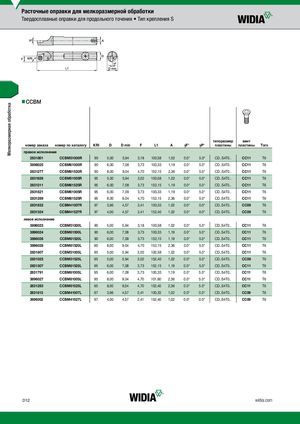 Мелкоразмерная обработка Расточные оправки для мелкоразмерной обработки Твердосплавные оправки для продольного точения • Тип крепления S nnCCBM типоразмер винт номер заказа номер по каталогу KRI D D min F L1 A γF° γP° пластины пластины Torx правое исполнение 2831801 CCBM51000R 90 5,00 5,94 3,18 100,58 1,02 0.0° 5.0° CD..S4T0.. CC11 T6 3896025 CCBM61000R 90 6,00 7,08 3,73 100,33 1,19 0.0° 5.0° CD..S4T0.. CC11 T6 2831277 CCBM81520R 90 8,00 9,04 4,70 152,15 2,36 0.0° 5.0° CD..S4T0.. CC11 T6 2831826 CCBM51005R 95 5,00 5,94 3,02 100,58 1,02 0.0° 5.0° CD..S4T0.. CC11 T6 2831311 CCBM61525R 95 6,00 7,08 3,73 152,15 1,19 0.0° 5.0° CD..S4T0.. CC11 T6 2831821 CCBM61005R 95 6,00 7,09 3,73 100,33 1,19 0.0° 5.0° CD..S4T0.. CC11 T6 2831289 CCBM81525R 95 8,00 9,04 4,70 152,15 2,36 0.0° 5.0° CD..S4T0.. CC11 T6 2831832 CCBM41007R 97 3,96 4,57 2,41 100,33 1,02 0.0° 0.0° CD..S4T0.. CC09 T6 2831324 CCBM41527R 97 4,00 4,57 2,41 152,40 1,02 0.0° 0.0° CD..S4T0.. CC09 T6 левое исполнение 3896023 CCBM51000L 90 5,00 5,94 3,18 100,58 1,02 0.0° 5.0° CD..S4T0.. CC11 T6 3896024 CCBM61000L 90 6,00 7,08 3,73 100,33 1,19 0.0° 5.0° CD..S4T0.. CC11 T6 3896026 CCBM61520L 90 6,00 7,09 3,73 152,15 1,19 0.0° 5.0° CD..S4T0.. CC11 T6 3896028 CCBM81520L 90 8,00 9,04 4,70 152,15 2,36 0.0° 5.0° CD..S4T0.. CC11 T6 2831807 CCBM51005L 95 5,00 5,94 3,02 100,58 1,02 0.0° 5.0° CD..S4T0.. CC11 T6 2831025 CCBM51525L 95 5,00 5,94 3,02 152,40 1,02 0.0° 5.0° CD..S4T0.. CC09 T6 2831307 CCBM61525L 95 6,00 7,08 3,73 152,15 1,19 0.0° 5.0° CD..S4T0.. CC11 T6 2831791 CCBM61005L 95 6,00 7,09 3,73 100,33 1,19 0.0° 5.0° CD..S4T0.. CC11 T6 3896027 CCBM81005L 95 8,00 9,04 4,70 101,60 2,36 0.0° 5.0° CD..S4T0.. CC11 T6 2831283 CCBM81525L 95 8,00 9,04 4,70 152,40 2,36 0.0° 5.0° CD..S4T0.. CC11 T6 2831813 CCBM41007L 97 3,96 4,57 2,41 100,33 1,02 0.0° 0.0° CD..S4T0.. CC09 T6 3896002 CCBM41527L 97 4,00 4,57 2,41 152,40 1,02 0.0° 0.0° CD..S4T0.. CC09 T6 D12 widia.com