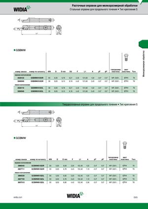 Мелкоразмерная обработка Расточные оправки для мелкоразмерной обработки Стальные оправки для продольного точения • Тип крепления S nnGSBMW типоразмер винт номер заказа номер по каталогу KRI D D min D2 F L1 A γF° γP° пластины пластины Torx правое исполнение 2828122 GSBMW61003R 93 6,00 6,78 6,21 3,43 101,60 1,02 -3.0° 0.0° WP..S301.. CT11 T6 3886549 GSBMW81003R 93 8,00 8,10 8,18 4,42 101,60 2,40 -3.0° 0.0° WP..S301.. CT11 T6 левое исполнение 2828116 GSBMW61003L 93 6,00 6,78 6,21 3,43 101,60 1,02 -3.0° 0.0° WP..S301.. CT11 T6 3886548 GSBMW81003L 93 8,00 8,10 8,18 4,42 101,60 2,40 -3.0° 0.0° WP..S301.. CT11 T6 Твердосплавные оправки для продольного точения • Тип крепления S nnGCBMW типоразмер винт номер заказа номер по каталогу KRI D D min F L1 A γF° γP° пластины пластины Torx правое исполнение 3896040 GCBMW51523R 93 5,00 6,60 3,20 152,40 1,02 -3.0° 0.0° WP..S301.. CT11 T6 2827711 GCBMW61523R 93 6,00 6,78 3,43 152,40 1,19 -3.0° 0.0° WP..S301.. CT11 T6 левое исполнение 3896039 GCBMW51523L 93 5,00 6,60 3,20 152,40 1,02 -3.0° 0.0° WP..S301.. CT11 T6 2827705 GCBMW61523L 93 6,00 6,78 3,43 152,40 1,19 -3.0° 0.0° WP..S301.. CT11 T6 3897012 GCBMW81523L 93 8,00 8,80 4,42 152,40 2,36 -3.0° 0.0° WP..S301.. CT11 T6 widia.com D23