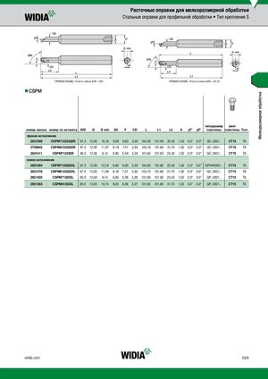 Мелкоразмерная обработка Расточные оправки для мелкоразмерной обработки Стальные оправки для профильной обработки • Тип крепления S ПРИМЕЧАНИЕ: Угол в плане KRI = 95°. ПРИМЕЧАНИЕ: Угол в плане KRI = 67,5°. nnCSPM типоразмер винт номер заказа номер по каталогу KRI D D min D2 F CD L L1 L4 A γF° γP° пластины пластины Torx правое исполнение 2831399 CSPM71225225R 67.5 12,00 10,16 6,60 6,60 3,30 104,00 101,60 25,40 1,02 0.0° 0.0° GC..0501.. CT15 T6 3758942 CSPM81232225R 67.5 12,00 11,37 8,18 7,01 2,92 105,16 101,60 31,75 1,02 0.0° 0.0° GC..0501.. CT15 T6 2831411 CSPM712255R 95.0 12,00 9,14 6,60 5,59 2,29 101,60 101,60 25,40 1,02 0.0° 0.0° GC..0501.. CT15 T6 левое исполнение 2831394 CSPM71225225L 67.5 12,00 10,16 6,60 6,60 3,30 104,00 101,60 25,40 1,02 0.0° 0.0° GPHW0501.. CT15 T6 2831378 CSPM81232225L 67.5 12,00 11,38 8,18 7,01 2,92 104,10 101,60 31,75 1,02 0.0° 0.0° GC..0501.. CT15 T6 2831405 CSPM712255L 95.0 12,00 9,14 6,60 5,59 2,29 101,60 101,60 25,40 1,02 0.0° 0.0° GP..0501.. CT15 T6 2831383 CSPM812325L 95.0 12,00 10,74 8,20 6,38 2,27 101,60 101,60 31,75 1,02 0.0° 0.0° GP..0501.. CT15 T6 widia.com D25