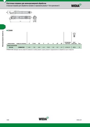 Мелкоразмерная обработка Расточные оправки для мелкоразмерной обработки Стальные оправки для обработки канавок и нарезания резьбы • Тип крепления S nnCSMM типоразмер винт номер заказа номер по каталогу D D min D2 F L1 A γF° γP° пластины пластины Torx правое исполнение 2831048 CSMM6760R 6,00 7,92 6,60 4,44 76,20 1,02 0.0° 0.0° CD.503..R CC11 T6 ПРИМЕЧАНИЕ: Выбирая пластину обратите внимание на глубину резания, ширину резания и предполагается ли обработка глухого отверстия. D28 widia.com