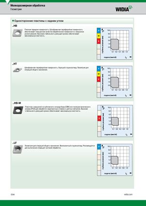apглубина резания (мм)apглубина резания (мм)apглубина резания (мм)apглубина резания (мм) Мелкоразмерная обработка Геометрии nnОдносторонние пластины с задним углом ..HB Плоская передняя поверхность. Шлифованная периферийная поверхностьобеспечивает повышенное качество обработанной поверхности и невысокиеP усилия резания. Высокая стабильность режущей кромки обеспечивает максимальную жесткость. M K подача (мм/об) fn ..HT Шлифованная периферийная поверхность. Хороший стружкоотвод. Геометрия дляопераций общего назначения.P M K подача (мм/об) fn ..HB-M Пластина с вершиной из кубического нитрида бора (CBN) или поликристаллического алмаза (PCD) для обработки жаропрочных сплавов и цветных металлов. Высокая стабильность режущей кромки обеспечивает максимальную жесткость. K подача (мм/об) fn ..LF Геометрия для операций общего назначения. Великолепный стружкоотвод. Рекомендуетсядля выполнения операций чистовой обработки.P подача (мм/об) fn D34 widia.com