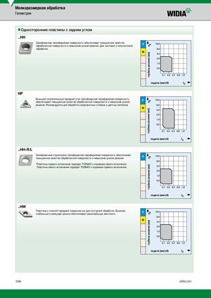 apглубина резания (мм)apглубина резания (мм)apглубина резания (мм)apглубина резания (мм) Мелкоразмерная обработка Геометрии nnОдносторонние пластины с задним углом ..HH Шлифованная периферийная поверхность обеспечивает повышенное качествообработанной поверхности и невысокие усилия резания. Для чистовой и получистовойP обработки. M подача (мм/об) fn HP Большой положительный передний угол. Шлифованная периферийная поверхностьобеспечивает повышенное качество обработанной поверхности и невысокие усилияP резания. Рекомендуется для обработки жаропрочных сплавов и цветных металлов. M подача (мм/об) fn ..HH-R/L Шлифованный стружколом. Шлифованная периферийная поверхность обеспечиваетповышенное качество обработанной поверхности и невысокие усилия резания.P *Пластины правого исполнения подходят ТОЛЬКО к оправкам левого исполнения. Пластины левого исполнения подходят ТОЛЬКО к оправкам правого исполнения. подача (мм/об) fn ..HW Пластина с плоской передней поверхностью для контурной обработки. Высокаястабильность режущей кромки обеспечивает максимальную жесткость.P M подача (мм/об) fn D36 widia.com
