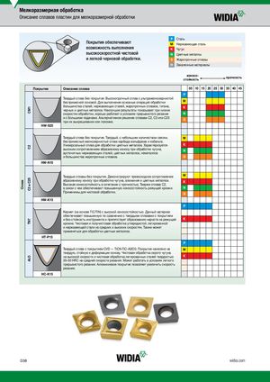 Сплав CM1C2C3 и C25TN7ALO Мелкоразмерная обработка Описание сплавов пластин для мелкоразмерной обработки P Сталь Покрытия обеспечивают M Нержавеющая сталь возможность выполнения K Чугун высокоскоростной чистовой N Цветные металлы и легкой черновой обработки. S Жаропрочные сплавы H Закаленные материалы износо-стойкость прочность Покрытие Описание сплава 05 10 15 20 25 30 35 40 45 P Твердый сплав без покрытия. Высокопрочный сплав с ультрамелкозернистой беспримесной основой. Для выполнения основных операций обработки M большинства сталей, нержавеющих сталей, жаропрочных сплавов, титана, K черных и цветных металлов. Наилучшие результаты показывает при низких скоростях обработки, хорошо работает в условиях прерывистого резания N и с большими подачами. Альтернативное решение сплавам C2, C3 или C25при их выкрашивании или поломке.S HW-S25 Твердый сплав без покрытия. Твердый, с небольшим количеством связки, M беспримесный мелкозернистый сплав карбида вольфрама и кобальта. Универсальный сплав для обработки цветных металлов. Характеризуется K высоким сопротивлением абразивному износу при обработке чугуна, N аустенитных нержавеющих сталей, цветных металлов, неметаллов и большинства жаропрочных сплавов. S HW-N15 Твердые сплавы без покрытия. Демонстрируют превосходное сопротивление M абразивному износу при обработке чугуна, алюминия и цветных металлов. K Высокая износостойкость в сочетании с прочностью. Тверже сплава C2, в связи с чем обеспечивают повышенную износостойкость режущей кромки. N Применимы для чистовой обработки. S HW-K15 P Кермет (на основе TiC/TiN) с высокой износостойкостью. Данный материал обеспечивает повышенную по сравнению с твердыми сплавами с покрытием и без стойкость инструмента и препятствует образованию нароста на режущей K кромке. Чистовая и получистовая обработка углеродистой, легированной и нержавеющей стали на средних и высоких скоростях. Также может применяться для обработки цветных металлов. HT-P15 P Твердый сплав с покрытием CVD — TiCN-TiC-Al2O3. Покрытие нанесено на M твердую, стойкую к деформации основу. Чистовая обработка серого чугуна на высокой скорости и чистовая обработка легированных сталей твердостью K 35–50 HRC на средней скорости резания. Может работать в условиях легкого прерывистого резания. Алюминиевое покрытие позволяет увеличить скорость резания. HC-K15 D38 widia.com