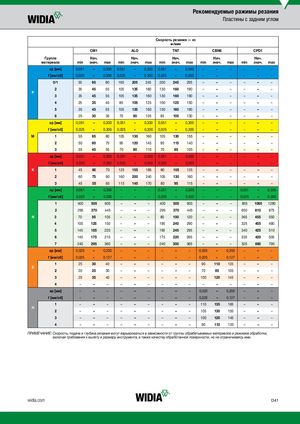 Рекомендуемые ражимы резания Пластины с задним углом Скорость резания — vc м/мин CM1 ALO TN7 CBN6 CPD1 Группа Нач. Нач. Нач. Нач. Нач. материала min знач. max min знач. max min знач. max min знач. max min знач. max ap [мм] 0,051 – 0,300 0,051 – 0,300 0,051 – 0,300 – – – – – – f [мм/об] 0,025 – 0,300 0,025 – 0,300 0,025 – 0,300 – – – – – – 0/1 55 65 80 165 205 245 200 245 295 – – – – – – 2 35 45 55 105 135 160 130 160 190 – – – – – – P 3 35 45 55 105 135 160 130 160 190 – – – – – – 4 25 35 40 85 105 125 100 125 150 – – – – – – 5 35 45 55 105 135 160 130 160 190 – – – – – – 6 25 30 35 70 90 105 85 105 130 – – – – – – ap [мм] 0,051 – 0,300 0,051 – 0,300 0,051 – 0,300 – – – – – – f [мм/об] 0,025 – 0,300 0,025 – 0,300 0,025 – 0,300 – – – – – – M 1 55 65 80 105 130 160 105 130 155 – – – – – – 2 50 60 75 95 120 145 95 115 140 – – – – – – 3 35 45 55 70 90 110 70 85 105 – – – – – – ap [мм] 0,051 – 0,300 0,051 – 0,300 0,051 – 0,300 – – – – – – f [мм/об] 0,025 – 0,300 0,025 – 0,300 0,025 – 0,300 – – – – – – K 1 45 60 70 125 155 185 80 105 125 – – – – – – 2 60 75 90 160 200 240 105 130 160 – – – – – – 3 45 55 65 115 145 170 80 95 115 – – – – – – ap [мм] 0,051 – 0,300 – – – 0,051 – 0,300 – – – 0,051 – 0,300 f [мм/об] 0,025 – 0,300 – – – 0,025 – 0,300 – – – 0,025 – 0,300 1 400 505 605 – – – 400 505 605 – – – 855 1065 1280 2 295 370 445 – – – 295 370 445 – – – 650 810 975 N 3 70 85 105 – – – 80 100 120 – – – 365 455 550 4 100 125 150 – – – 195 240 290 – – – 325 405 490 5 145 185 220 – – – 195 245 295 – – – 340 425 510 6 140 175 210 – – – 175 220 265 – – – 335 420 505 7 240 295 360 – – – 240 300 365 – – – 525 660 790 ap [мм] 0,025 – 0,200 – – – – – – 0,025 – 0,200 – – – f [мм/об] 0,025 – 0,127 – – – – – – 0,025 – 0,127 – – – 1 25 30 40 – – – – – – 90 110 135 – – – S 2 20 25 30 – – – – – – 70 85 105 – – – 3 25 35 40 – – – – – – 100 120 145 – – – 4 – – – – – – – – – – – – – – – ap [мм] – – – – – – – – – 0,025 – 0,200 – – – f [мм/об] – – – – – – – – – 0,025 – 0,127 – – – 1 – – – – – – – – – 110 135 165 – – – H 2 – – – – – – – – – 105 130 155 – – – 3 – – – – – – – – – 100 120 145 – – – 4 – – – – – – – – – 90 110 135 – – – ПРИМЕЧАНИЕ: С корость, подача и глубина резания могут варьироваться в зависимости от группы обрабатываемых материалов и режимов обработки, включая требования к вылету и размеру инструмента, а также качеству обработанной поверхности, но не ограничиваясь ими. widia.com D41