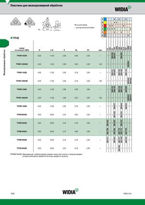 Мелкоразмерная обработка C2––––––––282183428217992821371– C25–––––––––––– C32824236–2824191–2824122––––––– CG52824251–2824200–2824136–28240772821402282139728213922821381– CG55–––––––––––– CG6––2824195–2824129––––282177828213772821822 CM12824220–2824168–2824104–28240442821844282181628217722821349– ALO–––––––––––– TN7––2824148–2824090–2824037––28217492821331– CBN6–2823954–2823949–2823942–––––– CPD1–––2824022–2824015–––––– Пластины для мелкоразмерной обработки P v j v j j v M j j j v v j j j j (M) v лучший выбор K j v v j j j j v jj альтернативный выбор N v v v v j j j v S j j j v j v j H v nnTPHB номер по каталогу (ISO) D L10 S Rε D1 max TPHB1102X0 6,35 11,00 2,38 0,05 3,30 — TPHB1102X0M 6,35 11,00 2,38 0,05 3,30 1,62 TPHB110202 6,35 11,00 2,38 0,18 3,30 — TPHB110202M 6,35 11,00 2,38 0,18 3,30 1,62 TPHB110204 6,35 11,00 2,38 0,38 3,30 — TPHB110204M 6,35 11,00 2,38 0,40 3,30 1,62 TPHB110208 6,35 11,00 2,38 0,79 3,30 — TPHB1603X0 9,53 16,50 3,18 0,05 3,30 — TPHB160302 9,53 16,50 3,18 0,18 3,30 — TPHB160304 9,53 16,50 3,18 0,38 3,30 — TPHB160308 9,53 16,50 3,18 0,79 3,30 — TPCB160302 9,53 16,50 3,23 0,18 3,30 — ПРИМЕЧАНИЕ: М аксимальная глубина резания указана только для пластин с микровставками, которые обозначены буквой M на конце номера по каталогу. D50 widia.com
