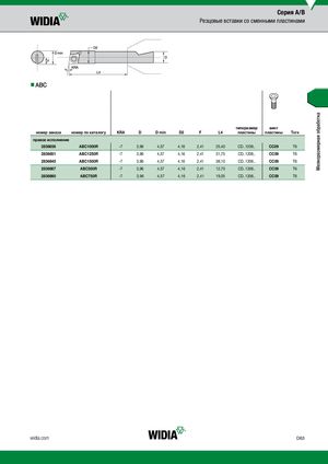 Мелкоразмерная обработка Серия A/B Резцовые вставки со сменными пластинами nnABC типоразмер винт номер заказа номер по каталогу KRA D D min D2 F L4 пластины пластины Torx правое исполнение 2836656 ABC1000R -7 3,96 4,57 4,16 2,41 25,40 CD..1206.. CC09 T6 2836651 ABC1250R -7 3,96 4,57 4,16 2,41 31,75 CD..1206.. CC09 T6 2836645 ABC1500R -7 3,96 4,57 4,16 2,41 38,10 CD..1206.. CC09 T6 2836667 ABC500R -7 3,96 4,57 4,16 2,41 12,70 CD..1206.. CC09 T6 2836660 ABC750R -7 3,96 4,57 4,16 2,41 19,05 CD..1206.. CC09 T6 widia.com D63