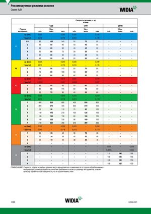 Рекомендуемые режимы резания Серия A/B Скорость резания — vc м/мин CG5 CM1 CBN6 Группа Нач. Нач. Нач. материала min знач. max min знач. max min знач. max ap [мм] 0,025 - 0,200 0,025 - 0,203 – – – f [мм/об] 0,013 - 0,178 0,013 - 0,178 – – – 0/1 95 120 145 55 70 85 – – – 2 65 80 90 40 45 55 – – – P 3 65 80 90 40 45 55 – – – 4 50 60 75 30 35 45 – – – 5 65 80 95 40 45 55 – – – 6 45 55 65 25 30 40 – – – ap [мм] 0,025 - 0,200 0,025 - 0,200 – – – f [мм/об] 0,013 - 0,178 0,013 - 0,178 – – – M 1 75 95 110 55 70 85 – – – 2 70 85 100 50 65 75 – – – 3 55 65 80 40 50 55 – – – ap [мм] 0,001 - 0,010 0,001 - 0,010 – – – f [мм/об] 0,0005 - 0,007 0,0005 - 0,007 – – – K 1 65 80 95 50 60 75 – – – 2 80 95 115 60 75 90 – – – 3 55 70 85 45 55 65 – – – ap [мм] 0,025 – 0,640 0,025 – 0,640 – – – f [мм/об] 0,013 – 0,178 0,013 – 0,178 – – – 1 405 505 605 405 505 605 – – – 2 300 370 445 300 370 445 – – – N 3 75 95 110 70 90 105 – – – 4 140 175 210 105 125 155 – – – 5 100 125 150 80 100 120 – – – 6 100 125 150 80 100 120 – – – 7 240 300 360 240 300 360 – – – ap [мм] 0,025 - 0,200 0,025 - 0,200 – – – f [мм/об] 0,013 - 0,178 0,013 - 0,178 – – – 1 30 35 40 55 70 85 – – – S 2 20 30 35 45 55 65 – – – 3 35 40 50 30 35 45 – – – 4 – – – – – – – – – ap [мм] – – – – – – 0,025 - 0,200 f [мм/об] – – – – – – 0,0005 - 0,004 1 – – – – – – 110 140 165 H 2 – – – – – – 105 130 155 3 – – – – – – 100 125 150 4 – – – – – – 100 125 150 ПРИМЕЧАНИЕ: С корость, подача и глубина резания могут варьироваться в зависимости от группы обрабатываемых материалов и режимов обработки, включая требования к вылету и размеру инструмента, а также качеству обработанной поверхности, но не ограничиваясь ими. D66 widia.com