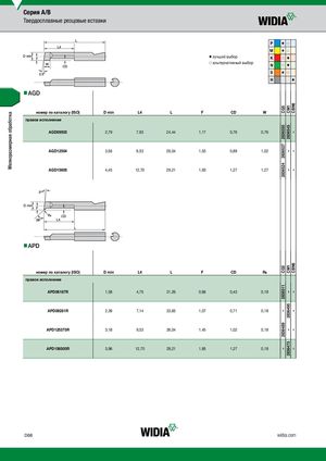 Мелкоразмерная обработка CG5283655028365372836524CG52836511–2836489– CM12836545––CM1–2836495–2836473 CBN6–––CBN6–––– Серия A/B Твердосплавные резцовые вставки P v j M v j v лучший выбор K j v j альтернативный выбор N j v S v j H v nnAGD номер по каталогу (ISO) D min L4 L F CD W правое исполнение AGD09503 2,79 7,93 24,44 1,17 0,76 0,76 AGD12504 3,56 9,53 26,04 1,55 0,89 1,02 AGD15605 4,45 12,70 29,21 1,93 1,27 1,27 nnAPD номер по каталогу (ISO) D min L4 L F CD Rε правое исполнение APD06187R 1,58 4,75 21,26 0,66 0,43 0,18 APD09281R 2,39 7,14 23,65 1,07 0,71 0,18 APD125375R 3,18 9,53 26,04 1,45 1,02 0,18 APD156500R 3,96 12,70 29,21 1,85 1,27 0,18 D68 widia.com