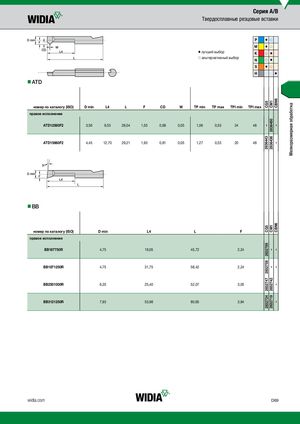CG5–2836443CG52832769283275828327472832724 CM128364502836436CM1––28327422832719 CBN6––CBN6–––– Мелкоразмерная обработка Серия A/B Твердосплавные резцовые вставки P v j M v j v лучший выбор K j v j альтернативный выбор N j v S v j H v nnATD номер по каталогу (ISO) D min L4 L F CD W TP min TP max TPI min TPI max правое исполнение ATD12560F2 3,56 9,53 26,04 1,55 0,69 0,05 1,06 0,53 24 48 ATD15660F2 4,45 12,70 29,21 1,93 0,81 0,05 1,27 0,53 20 48 nnBB номер по каталогу (ISO) D min L4 L F правое исполнение BB187750R 4,75 19,05 45,72 2,24 BB1871250R 4,75 31,75 58,42 2,24 BB2501000R 6,35 25,40 52,07 3,05 BB3121250R 7,93 53,98 80,65 3,84 widia.com D69