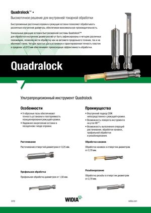 Quadralock™ • Высокоточное решение для внутренней токарной обработки Быстросменные расточные оправки и режущие вставки позволяют обрабатывать различные внутренние диаметры, обеспечивая максимальную производительность. Уникальные режущие вставки быстросменной системы Quadralock™ для обработки внутренних диаметров могут быть зафиксированы в четырех различных положениях, позволяя вести обработку как на автомате продольного точения, так и на обычном станке. Четыре простых шага установки и гарантированная точность пластин в пределах ±0,013 мм обеспечивают превосходную эффективность обработки. Quadralock Ультрапрецизионный инструмент Quadralock Особенности Преимущества • V-образные пазы обеспечивают • Внутренний подвод СОЖ точность установки и повторяемость непосредственно к режущей кромке. позиционирования режущей кромки. • Возможность поворота инструмента • Надежное закрепление вставки в на угол 90°˚˚. посадочном гнезде оправки. • Возможность выполнения операций растачивания, обработки канавок, профильной обработки и резьбонарезания. Растачивание Обработка канавок Растачивание отверстий диаметром от 0,25 мм. Обработка канавок в отверстии диаметром от 2,79 мм. Профильная обработка Резьбонарезание Профильная обработка диаметров от 1,58 мм. Обработка резьбы в отверстии диаметром от 2,79 мм. D72 widia.com