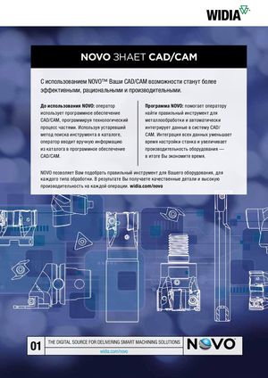 NOVO ЗНАЕТ CAD/CAM С использованием NOVO™ Ваши CAD/CAM возможности станут более эффективными, рациональными и производительными. До использования NOVO: оператор Программа NOVO: помогает оператору использует программное обеспечение найти правильный инструмент для CAD/CAM, программируя технологический металлообработки и автоматически процесс частями. Используя устаревший интегрирует данные в систему CAD/ метод поиска инструмента в каталоге, CAM. Интеграция всех данных уменьшает оператор вводит вручную информацию время настройки станка и увеличивает из каталога в программное обеспечение производительность оборудования — CAD/CAM. в итоге Вы экономите время. NOVO позволяет Вам подобрать правильный инструмент для Вашего оборудования, для каждого типа обработки. В результате Вы получаете качественные детали и высокую производительность на каждой операции. widia.com/novo D75