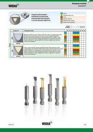 Сплав CM1CG5 Описание сплавов Quadralock™ P Сталь Покрытия обеспечивают M Нержавеющая сталь возможность выполнения K Чугун высокоскоростной чистовой N Цветные металлы и легкой черновой обработки. S Жаропрочные сплавы H Закаленные материалы износо-стойкость прочность Покрытие Описание сплава 05 10 15 20 25 30 35 40 45 P Твердый сплав без покрытия. Высокопрочный сплав с ультрамелкозернистой M беспримесной основой. Для выполнения основных операций обработки большинства сталей, нержавеющих сталей, жаропрочных сплавов, титана, K черных и цветных металлов. Наилучшие результаты показывает при низкихскоростях обработки, хорошо работает в условиях прерывистого резанияN и с большими подачами. S HW-S25 P Сплав с покрытием TiN, нанесенным PVD методом. Беспримесная основа M с содержанием кобальта 9,5%. Субмикронное зерно. Для выполнения основных операций обработки нержавеющих сталей, жаропрочных сплавов, титана, K черных и цветных металлов. Наилучшие результаты показывает при низкихскоростях обработки, хорошо работает в условиях прерывистого резанияN и с большими подачами. S HC-S25 widia.com D77