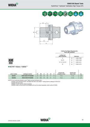 KM4X100 Shank Tools HydroForce™ Hydraulic Toolholders High Torque (HT) Cutting Tool Shank Requirements metric (ISO standard) cutting tool shank diameter tolerance 6 h6 0,000/-0,008 8 & 10 h6 0,000/-0,009 12, 14, 16, & 18 h6 0,000/-0,011 20 h6 0,000/-0,013 HCTHT • Metric • KM4X™ wrench size wrench size order number catalogue number D1 D2 L1 L2 L9 V actuation screw stop screw kg 5520991 KM4X100HCTHT20085M 20 65,0 85 56 41 10 5 mm 5 mm 3,53 5520992 KM4X100HCHT32095M 32 80,0 95 66 51 10 6 mm 6 mm 4,37 NOTE: Do not overtorque actuation screw. Tighten by hand until stop is felt. Hydraulic chuck technical section, see pages K60–K63 of the WIDIA™ Tooling Systems catalogue A-09-02122. Supplied with stop screw. Actuation wrench must be ordered separately. KM4X63 coolant unit and wrench are available and must be ordered separately; order number 5572428. WWW.WIDIA.COM 69