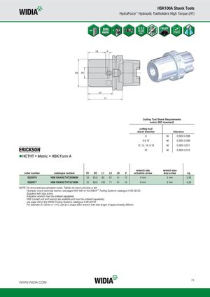 HSK100A Shank Tools HydroForce™ Hydraulic Toolholders High Torque (HT) Cutting Tool Shank Requirements metric (ISO standard) cutting tool shank diameter tolerance 6 h6 0,000/-0,008 8 & 10 h6 0,000/-0,009 12, 14, 16, & 18 h6 0,000/-0,011 20 h6 0,000/-0,013 HCTHT • Metric • HSK Form A wrench size wrench size order number catalogue number D1 D2 L1 L2 L9 V actuation screw stop screw kg 5520976 HSK100AHCTHT20090M 20 65,0 90 61 41 10 5 mm 5 mm 3,38 5520977 HSK100AHCTHT32100M 32 80,0 100 71 51 10 6 mm 6 mm 4,29 NOTE: Do not overtorque actuation screw. Tighten by hand until stop is felt. Hydraulic chuck technical section, see pages K60–K63 of the WIDIA™ Tooling Systems catalogue A-09-02122. Supplied with stop screw. Actuation wrench must be ordered separately. HSK coolant unit and wrench are available and must be ordered separately; see page J32 of the WIDIA Tooling Systems catalogue A-09-02122. For diameter D1 32mm (1-1/4"), use an L-shape Allen wrench with side length of approximately 200mm. WWW.WIDIA.COM 71