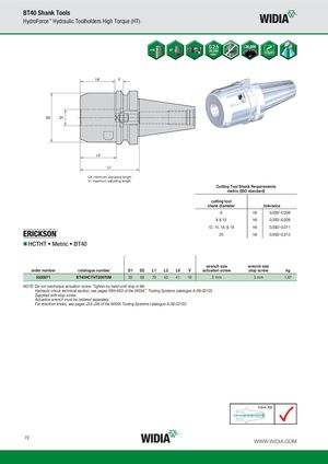 BT40 Shank Tools HydroForce™ Hydraulic Toolholders High Torque (HT) L9: minimum clamping length V: maximum adjusting length Cutting Tool Shank Requirements metric (ISO standard) cutting tool shank diameter tolerance 6 h6 0,000/-0,008 8 & 10 h6 0,000/-0,009 12, 14, 16, & 18 h6 0,000/-0,011 20 h6 0,000/-0,013 HCTHT • Metric • BT40 wrench size wrench size order number catalogue number D1 D2 L1 L2 L9 V actuation screw stop screw kg 5520971 BT40HCTHT20070M 20 58 70 43 41 10 5 mm 5 mm 1,67 NOTE: Do not overtorque actuation screw. Tighten by hand until stop is felt. Hydraulic chuck technical section, see pages K60–K63 of the WIDIA™ Tooling Systems catalogue A-09-02122. Supplied with stop screw. Actuation wrench must be ordered separately. For retention knobs, see pages J33–J38 of the WIDIA Tooling Systems catalogue A-09-02122. 72 WWW.WIDIA.COM