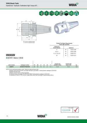 DV40 Shank Tools HydroForce™ Hydraulic Toolholders High Torque (HT) L9: minimum clamping length V: maximum adjusting length Cutting Tool Shank Requirements metric (ISO standard) cutting tool shank diameter tolerance 6 h6 0,000/-0,008 8 & 10 h6 0,000/-0,009 12, 14, 16, & 18 h6 0,000/-0,011 20 h6 0,000/-0,013 HCTHT • Metric • DV40 wrench size wrench size order number catalogue number D1 D2 L1 L2 L9 V actuation screw stop screw kg 5520973 DV40HCTHT20070M 20 58 70 51 41 10 5 mm 5 mm 1,58 NOTE: Do not overtorque actuation screw. Tighten by hand until stop is felt. Hydraulic chuck technical section, see pages K60–K63 of the WIDIA™ Tooling Systems catalogue A-09-02122. Supplied with stop screw. Actuation wrench must be ordered separately. For retention knobs, see pages J33–J38 of the WIDIA Tooling Systems catalogue A-09-02122. For diameter D1 32mm (1-1/4"), use an L-shape Allen wrench with side length of approximately 200mm. 74 WWW.WIDIA.COM