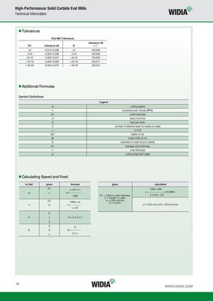 High-Performance Solid Carbide End Mills Technical Information Tolerances End Mill Tolerances tolerance h6 D1 tolerance e8 D +/- )3 -0,014/-0,028 )3 0/0,006 >3–6 -0,020/-0,038 >3–6 0/0,008 >6–10 -0,025/-0,047 >6–10 0/0,009 >10–18 -0,032/-0,059 >10–18 0/0,011 >18–30 -0,040/-0,073 >18–30 0/0,013 Additional Formulas Symbol Definitions Legend vc cutting speed n revolutions per minute (RPM) D1 cutter diameter vf feed (mm/min) fz feed per tooth Z number of effective teeth or inserts in cutter / 3.1416 Ap1 depth of cut ae radial width of cut D diameter of insert (round inserts) hm average chip thickness h chip thickness rr cutting edge lead angle Calculating Speed and Feed to find given formula given calculated D1 / x D1 x n 1000 x 200 vc n vc = n= = 510 RPM 1000 D1 = 125mm cutter diameter 3.1416 x 125 Z = 8 teeth in cutter D1 1000 x vcnvcn= vc = 200 mm/minfz = 0,2mm vf = 0,20 x 8 x 510 = 816 mm/min / x D1 fz vf n vf = fz x Z x n Z Z vf fz vf fz = n Zxn 78 WWW.WIDIA.COM