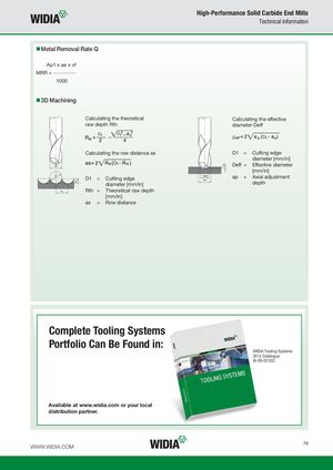 R th ap High-Performance Solid Carbide End Mills Technical Information Metal Removal Rate Q Ap1 x ae x vf MRR = 1000 3D Machining Calculating the theoretical Calculating the effective raw depth Rth diameter Deff D D D D Calculating the row distance as D1 = Cutting edge diameter [mm/in] DD1 Deff = Effective diameter [mm/in] D1 D1 = Cutting edge Deff ap = Axial adjustmentD1 diameter [mm/in] depth as Rth = Theoretical raw depth [mm/in] as = Row distance Complete Tooling Systems Portfolio Can Be Found in: WIDIA Tooling Systems 2012 Catalogue (A-09-02122) Available at www.widia.com or your local distribution partner. WWW.WIDIA.COM 79