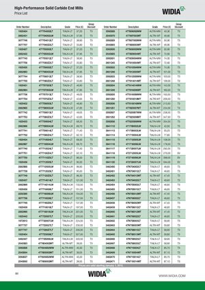 High-Performance Solid Carbide End Mills Price List Group Group Order Number Description Grade Price (€) Discount Order Number Description Grade Price (€) Discount 1920424 477704002LT TIALN-LT 37,20 T3 3592828 477806002MW ALTIN-MW 40,30 T3 2882431 477704002LW TIALN-LW 37,95 T3 2545570 477807003MT ALTIN-MT 49,85 T3 3077746 477704012LT TIALN-LT 38,90 T3 3592829 477807003MW ALTIN-MW 50,90 T3 3077757 4777040Z2LT TIALN-LT 33,80 T3 2545603 477808003MT ALTIN-MT 49,85 T3 1920427 477705002LT TIALN-LT 37,20 T3 3592830 477808003MW ALTIN-MW 50,90 T3 2882432 477705002LW TIALN-LW 37,95 T3 2545605 477809004MT ALTIN-MT 72,60 T3 3077745 477705012LT TIALN-LT 38,90 T3 3592831 477809004MW ALTIN-MW 74,00 T3 3077756 4777050Z2LT TIALN-LT 33,80 T3 2601245 477810004MT ALTIN-MT 72,60 T3 1920430 477706002LT TIALN-LT 37,20 T3 3592832 477810004MW ALTIN-MW 74,00 T3 2882983 477706002LW TIALN-LW 37,95 T3 2601246 477812005MT ALTIN-MT 101,00 T3 3077744 477706012LT TIALN-LT 38,90 T3 3592833 477812005MW ALTIN-MW 103,00 T3 3077755 4777060Z2LT TIALN-LT 33,80 T3 2601248 477814014MT ALTIN-MT 139,00 T3 1920431 477707003LT TIALN-LT 46,90 T3 3592834 477814014MW ALTIN-MW 142,00 T3 2882984 477707003LW TIALN-LW 47,85 T3 2601249 477816006MT ALTIN-MT 160,50 T3 3077736 477707013LT TIALN-LT 49,05 T3 3592835 477816006MW ALTIN-MW 163,50 T3 3077754 4777070Z3LT TIALN-LT 42,65 T3 2601250 477818018MT ALTIN-MT 209,50 T3 1920432 477708003LT TIALN-LT 46,90 T3 3592836 477818018MW ALTIN-MW 213,50 T3 2882985 477708003LW TIALN-LW 47,85 T3 2601251 477820007MT ALTIN-MT 234,00 T3 3077742 477708013LT TIALN-LT 49,05 T3 3592837 477820007MW ALTIN-MW 238,50 T3 3077753 4777080Z3LT TIALN-LT 42,65 T3 2601252 477825008MT ALTIN-MT 347,50 T3 1920433 477709004LT TIALN-LT 68,30 T3 3592838 477825008MW ALTIN-MW 354,50 T3 2882986 477709004LW TIALN-LW 69,70 T3 3641112 471706002LW TIALN-LW 42,50 T3 3077741 477709014LT TIALN-LT 71,40 T3 3641113 471708003LW TIALN-LW 55,20 T3 3077752 4777090Z4LT TIALN-LT 62,10 T3 3641114 471710004LW TIALN-LW 77,80 T3 1920434 477710004LT TIALN-LT 68,30 T3 3641115 471712005LW TIALN-LW 108,00 T3 2882987 477710004LW TIALN-LW 69,70 T3 3641116 471716006LW TIALN-LW 179,50 T3 3077740 477710024LT TIALN-LT 71,40 T3 3641117 471720007LW TIALN-LW 292,00 T3 3077751 4777100Z4LT TIALN-LT 62,10 T3 3641118 472712005LW TIALN-LW 270,00 SV 3077750 4777110Z5LT TIALN-LT 86,30 T3 3641119 472716006LW TIALN-LW 398,00 SV 1920436 477712005LT TIALN-LT 95,00 T3 3641120 472720007LW TIALN-LW 594,00 SV 2882988 477712005LW TIALN-LW 96,90 T3 3462450 47N704002LT TIALN-LT 46,65 T3 3077739 477712025LT TIALN-LT 95,00 T3 3462451 47N704012LT TIALN-LT 46,65 T3 3077749 4777120Z5LT TIALN-LT 86,30 T3 3462452 47N704012MT ALTIN-MT 47,45 T3 1920437 477714014LT TIALN-LT 131,00 T3 3462453 47N704022LT TIALN-LT 46,65 T3 2882989 477714014LW TIALN-LW 133,50 T3 3462454 47N705002LT TIALN-LT 46,65 T3 1920438 477716006LT TIALN-LT 151,00 T3 3462455 47N705012LT TIALN-LT 46,65 T3 2202395 477716006LW TIALN-LW 154,00 T3 3462456 47N705012MT ALTIN-MT 47,45 T3 3077738 477716026LT TIALN-LT 157,50 T3 3462457 47N706002LT TIALN-LT 46,65 T3 3077748 4777160Z6LT TIALN-LT 137,00 T3 3462458 47N706002MT ALTIN-MT 47,45 T3 1920439 477718018LT TIALN-LT 197,00 T3 3462459 47N706012LT TIALN-LT 46,65 T3 2882990 477718018LW TIALN-LW 201,00 T3 3462460 47N706012MT ALTIN-MT 47,45 T3 1920442 477720007LT TIALN-LT 220,50 T3 3462461 47N706022LT TIALN-LT 46,65 T3 1972613 477720007LW TIALN-LW 224,50 T3 3462462 47N708003LT TIALN-LT 58,90 T3 3077737 477720027LT TIALN-LT 230,50 T3 3462463 47N708003MT ALTIN-MT 59,80 T3 3077747 4777200Z7LT TIALN-LT 200,00 T3 3462464 47N708013LT TIALN-LT 58,90 T3 1920454 477725008LT TIALN-LT 327,00 T3 3462465 47N708013MT ALTIN-MT 59,80 T3 3462447 477725008LW TIALN-LW 333,50 T3 3462466 47N708023LT TIALN-LT 58,90 T3 2545563 477804002MT ALTIN-MT 39,55 T3 3462467 47N708033LT TIALN-LT 58,90 T3 3592826 477804002MW ALTIN-MW 40,30 T3 3462468 47N710004LT TIALN-LT 85,70 T3 2545564 477805002MT ALTIN-MT 39,55 T3 3462469 47N710004MT ALTIN-MT 87,10 T3 3592827 477805002MW ALTIN-MW 40,30 T3 3462470 47N710014LT TIALN-LT 85,70 T3 2545565 477806002MT ALTIN-MT 39,55 T3 3462471 47N710014MT ALTIN-MT 87,10 T3 Prices are valid starting January 1, 2015. 80 WWW.WIDIA.COM