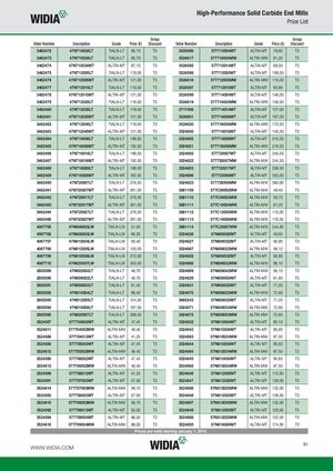 High-Performance Solid Carbide End Mills Price List Group Group Order Number Description Grade Price (€) Discount Order Number Description Grade Price (€) Discount 3462472 47N710024LT TIALN-LT 85,70 T3 3524596 577710004MT ALTIN-MT 79,60 T3 3462473 47N710034LT TIALN-LT 85,70 T3 3524617 577710004MW ALTIN-MW 81,20 T3 3462474 47N710034MT ALTIN-MT 87,10 T3 3524595 577710014MT ALTIN-MT 69,30 T3 3462475 47N712005LT TIALN-LT 119,00 T3 3524598 577712005MT ALTIN-MT 108,00 T3 3462476 47N712005MT ALTIN-MT 121,00 T3 3524618 577712005MW ALTIN-MW 110,00 T3 3462477 47N712015LT TIALN-LT 119,00 T3 3524597 577712015MT ALTIN-MT 93,90 T3 3462478 47N712015MT ALTIN-MT 121,00 T3 3524599 577714004MT ALTIN-MT 146,00 T3 3462479 47N712025LT TIALN-LT 119,00 T3 3524619 577714004MW ALTIN-MW 149,00 T3 3462480 47N712035LT TIALN-LT 119,00 T3 3717406 577714014MT ALTIN-MT 127,00 T3 3462481 47N712035MT ALTIN-MT 121,00 T3 3524601 577716006MT ALTIN-MT 167,00 T3 3462482 47N712045LT TIALN-LT 119,00 T3 3524620 577716006MW ALTIN-MW 170,50 T3 3462483 47N712045MT ALTIN-MT 121,00 T3 3524600 577716016MT ALTIN-MT 145,50 T3 3462484 47N716006LT TIALN-LT 189,50 T3 3524602 577718008MT ALTIN-MT 215,50 T3 3462485 47N716006MT ALTIN-MT 192,50 T3 3524621 577718008MW ALTIN-MW 219,50 T3 3462486 47N716016LT TIALN-LT 189,50 T3 3524605 577720007MT ALTIN-MT 240,00 T3 3462487 47N716016MT ALTIN-MT 192,50 T3 3524622 577720007MW ALTIN-MW 244,50 T3 3462488 47N716026LT TIALN-LT 189,50 T3 3524603 577720017MT ALTIN-MT 208,50 T3 3462489 47N716026MT ALTIN-MT 192,50 T3 3524606 577725008MT ALTIN-MT 353,00 T3 3462490 47N720007LT TIALN-LT 276,50 T3 3524623 577725008MW ALTIN-MW 360,00 T3 3462491 47N720007MT ALTIN-MT 281,00 T3 3881109 577C06002MW ALTIN-MW 48,40 T3 3462492 47N720017LT TIALN-LT 276,50 T3 3881110 577C08003MW ALTIN-MW 58,70 T3 3462493 47N720017MT ALTIN-MT 281,00 T3 3881111 577C10004MW ALTIN-MW 81,20 T3 3462494 47N720027LT TIALN-LT 276,50 T3 3881112 577C12005MW ALTIN-MW 110,00 T3 3462495 47N720027MT ALTIN-MT 281,00 T3 3881113 577C16006MW ALTIN-MW 170,50 T3 4067705 47N606002LW TIALN-LW 51,00 T3 3881114 577C20007MW ALTIN-MW 244,50 T3 4067706 47N608003LW TIALN-LW 66,30 T3 3524626 57N806002MT ALTIN-MT 49,50 T3 4067707 47N610004LW TIALN-LW 93,40 T3 3524627 57N806022MT ALTIN-MT 56,90 T3 4067708 47N612005LW TIALN-LW 130,00 T3 3524667 57N806022MW ALTIN-MW 58,10 T3 4067709 47N616006LW TIALN-LW 215,00 T3 3524628 57N806032MT ALTIN-MT 56,90 T3 4067710 47N620007LW TIALN-LW 350,50 T3 3524668 57N806032MW ALTIN-MW 58,10 T3 2605589 47N005002LT TIALN-LT 48,70 T3 3524669 57N806042MW ALTIN-MW 58,10 T3 2605590 47N006002LT TIALN-LT 48,70 T3 3524629 57N808003MT ALTIN-MT 61,90 T3 2605591 47N008003LT TIALN-LT 61,40 T3 3524631 57N808023MT ALTIN-MT 71,20 T3 2605592 47N010004LT TIALN-LT 89,40 T3 3524670 57N808023MW ALTIN-MW 72,60 T3 2605593 47N012005LT TIALN-LT 124,50 T3 3685243 57N808033MT ALTIN-MT 71,20 T3 2605594 47N016006LT TIALN-LT 197,50 T3 3524671 57N808033MW ALTIN-MW 72,60 T3 2605595 47N020007LT TIALN-LT 288,50 T3 3524672 57N808053MW ALTIN-MW 72,60 T3 3524587 577704002MT ALTIN-MT 47,45 T3 3524632 57N810004MT ALTIN-MT 83,10 T3 3524611 577704002MW ALTIN-MW 48,40 T3 3524643 57N810024MT ALTIN-MT 95,60 T3 3524586 577704012MT ALTIN-MT 41,25 T3 3524683 57N810024MW ALTIN-MW 97,50 T3 3524588 577705002MT ALTIN-MT 47,45 T3 3524644 57N810034MT ALTIN-MT 95,60 T3 3524612 577705002MW ALTIN-MW 48,40 T3 3524684 57N810034MW ALTIN-MW 97,50 T3 3524590 577706002MT ALTIN-MT 47,45 T3 3524645 57N810054MT ALTIN-MT 95,60 T3 3524613 577706002MW ALTIN-MW 48,40 T3 3524685 57N810054MW ALTIN-MW 97,50 T3 3524589 577706012MT ALTIN-MT 41,25 T3 3524646 57N812005MT ALTIN-MT 112,50 T3 3524591 577707003MT ALTIN-MT 57,50 T3 3524647 57N812025MT ALTIN-MT 129,50 T3 3524614 577707003MW ALTIN-MW 58,70 T3 3524686 57N812025MW ALTIN-MW 132,00 T3 3524593 577708003MT ALTIN-MT 57,50 T3 3524648 57N812035MT ALTIN-MT 129,50 T3 3524615 577708003MW ALTIN-MW 58,70 T3 3524687 57N812035MW ALTIN-MW 132,00 T3 3524592 577708013MT ALTIN-MT 50,00 T3 3524649 57N812055MT ALTIN-MT 129,50 T3 3524594 577709004MT ALTIN-MT 86,30 T3 3524688 57N812055MW ALTIN-MW 132,00 T3 3524616 577709004MW ALTIN-MW 88,00 T3 3524650 57N816006MT ALTIN-MT 174,50 T3 Prices are valid starting January 1, 2015. WWW.WIDIA.COM 81