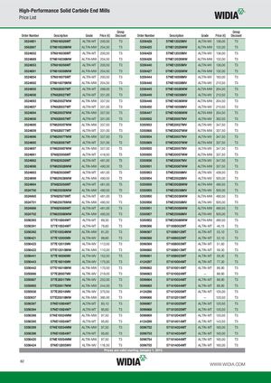 High-Performance Solid Carbide End Mills Price List Group Group Order Number Description Grade Price (€) Discount Order Number Description Grade Price (€) Discount 3524651 57N816026MT ALTIN-MT 200,50 T3 5356428 57NE12025MV ALTIN-MV 136,00 T3 3562867 57N816026MW ALTIN-MW 204,50 T3 5356425 57NE12025MW ALTIN-MW 132,00 T3 3524652 57N816036MT ALTIN-MT 200,50 T3 5356429 57NE12035MV ALTIN-MV 136,00 T3 3524689 57N816036MW ALTIN-MW 204,50 T3 5356426 57NE12035MW ALTIN-MW 132,00 T3 3524653 57N816056MT ALTIN-MT 200,50 T3 5356440 57NE12055MV ALTIN-MV 136,00 T3 3524691 57N816056MW ALTIN-MW 204,50 T3 5356427 57NE12055MW ALTIN-MW 132,00 T3 3524654 57N816076MT ALTIN-MT 200,50 T3 5356444 57NE16006MV ALTIN-MV 183,00 T3 3524692 57N816076MW ALTIN-MW 204,50 T3 5356448 57NE16026MV ALTIN-MV 210,50 T3 3524655 57N820007MT ALTIN-MT 288,00 T3 5356445 57NE16026MW ALTIN-MW 204,50 T3 3524656 57N820027MT ALTIN-MT 331,00 T3 5356449 57NE16036MV ALTIN-MV 210,50 T3 3524693 57N820027MW ALTIN-MW 337,50 T3 5356446 57NE16036MW ALTIN-MW 204,50 T3 3524657 57N820037MT ALTIN-MT 331,00 T3 5356450 57NE16056MV ALTIN-MV 210,50 T3 3524694 57N820037MW ALTIN-MW 337,50 T3 5356447 57NE16056MW ALTIN-MW 204,50 T3 3524658 57N820057MT ALTIN-MT 331,00 T3 5350932 57NE20007MV ALTIN-MV 302,50 T3 3524695 57N820057MW ALTIN-MW 337,50 T3 5350933 57NE20027MV ALTIN-MV 347,50 T3 3524659 57N820077MT ALTIN-MT 331,00 T3 5350868 57NE20027MW ALTIN-MW 337,50 T3 3524696 57N820077MW ALTIN-MW 337,50 T3 5350934 57NE20037MV ALTIN-MV 347,50 T3 3524660 57N820087MT ALTIN-MT 331,00 T3 5350869 57NE20037MW ALTIN-MW 337,50 T3 3524697 57N820087MW ALTIN-MW 337,50 T3 5350935 57NE20057MV ALTIN-MV 347,50 T3 3524661 57N825008MT ALTIN-MT 418,50 T3 5350930 57NE20057MW ALTIN-MW 337,50 T3 3524662 57N825028MT ALTIN-MT 481,00 T3 5350936 57NE20087MV ALTIN-MV 347,50 T3 3524698 57N825028MW ALTIN-MW 490,50 T3 5350931 57NE20087MW ALTIN-MW 337,50 T3 3524663 57N825038MT ALTIN-MT 481,00 T3 5350953 57NE25008MV ALTIN-MV 439,50 T3 3524699 57N825038MW ALTIN-MW 490,50 T3 5350954 57NE25028MV ALTIN-MV 505,00 T3 3524664 57N825058MT ALTIN-MT 481,00 T3 5350939 57NE25028MW ALTIN-MW 490,50 T3 3524700 57N825058MW ALTIN-MW 490,50 T3 5350955 57NE25038MV ALTIN-MV 505,00 T3 3524665 57N825078MT ALTIN-MT 481,00 T3 5350950 57NE25038MW ALTIN-MW 490,50 T3 3524701 57N825078MW ALTIN-MW 490,50 T3 5350956 57NE25058MV ALTIN-MV 505,00 T3 3524666 57N825088MT ALTIN-MT 481,00 T3 5350951 57NE25058MW ALTIN-MW 490,50 T3 3524702 57N825088MW ALTIN-MW 490,50 T3 5350957 57NE25088MV ALTIN-MV 505,00 T3 5356393 577E10004MT ALTIN-MT 69,30 T3 5350952 57NE25088MW ALTIN-MW 490,50 T3 5356391 577E10024MT ALTIN-MT 79,60 T3 5096566 571806002MT ALTIN-MT 46,15 T3 5356392 577E10024MW ALTIN-MW 81,20 T3 5096567 571806012MT ALTIN-MT 53,10 T3 5356421 577E12005MV ALTIN-MV 98,60 T3 5096568 571806022MT ALTIN-MT 53,10 T3 5356423 577E12015MV ALTIN-MV 113,50 T3 5096569 571808003MT ALTIN-MT 51,60 T3 5356422 577E12015MW ALTIN-MW 110,00 T3 5096660 571808013MT ALTIN-MT 59,30 T3 5356441 577E16006MV ALTIN-MV 152,50 T3 5096661 571808023MT ALTIN-MT 59,30 T3 5356443 577E16016MV ALTIN-MV 175,50 T3 4124297 571810004MT ALTIN-MT 77,30 T3 5356442 577E16016MW ALTIN-MW 170,50 T3 5096662 571810014MT ALTIN-MT 88,90 T3 5350866 577E20007MV ALTIN-MV 219,00 T3 5096663 571810024MT — 88,90 T3 5350867 577E20017MV ALTIN-MV 252,00 T3 5096664 571810034MT ALTIN-MT 88,90 T3 5350865 577E20017MW ALTIN-MW 244,50 T3 5096665 571810044MT ALTIN-MT 88,90 T3 5350938 577E25018MV ALTIN-MV 370,50 T3 4124298 571812005MT ALTIN-MT 105,00 T3 5350937 577E25018MW ALTIN-MW 360,00 T3 5096666 571812015MT — 120,50 T3 5356397 57NE10004MT ALTIN-MT 83,10 T3 5096667 571812025MT ALTIN-MT 120,50 T3 5356394 57NE10024MT ALTIN-MT 95,60 T3 5096668 571812035MT ALTIN-MT 120,50 T3 5356398 57NE10024MW ALTIN-MW 97,50 T3 5096669 571812045MT ALTIN-MT 120,50 T3 5356395 57NE10034MT ALTIN-MT 95,60 T3 4124299 571814014MT ALTIN-MT 143,50 T3 5356399 57NE10034MW ALTIN-MW 97,50 T3 5096752 571814024MT ALTIN-MT 165,00 T3 5356396 57NE10054MT ALTIN-MT 95,60 T3 5096753 571814034MT ALTIN-MT 165,00 T3 5356420 57NE10054MW ALTIN-MW 97,50 T3 5096754 571814044MT ALTIN-MT 165,00 T3 5356424 57NE12005MV ALTIN-MV 118,50 T3 5096755 571814054MT ALTIN-MT 165,00 T3 Prices are valid starting January 1, 2015. 82 WWW.WIDIA.COM