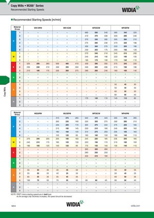 Copy Mills Copy Mills • M200™ Series Recommended Starting Speeds Recommended Starting Speeds [m/min] MaterialGroup WK15PM WK15CM WP20CM WP25PM 1 – – – – – – 660 580 540 395 340 325 2 – – – – – – 410 370 330 330 290 240 3 – – – – – – 370 330 305 305 260 210 P 4 – – – – – – 275 260 230 270 220 180 5 – – – – – – 330 300 275 220 205 180 6 – – – – – – 230 205 175 200 150 120 1 – – – – – – 270 240 210 245 215 200 M 2 – – – – – – 245 210 190 220 190 155 3 – – – – – – 190 175 150 170 145 115 1 325 295 260 505 460 410 430 390 355 275 245 220 K 2 250 230 210 400 355 330 340 305 280 215 190 180 3 210 190 175 335 300 275 290 260 240 180 160 145 1 – – – – – – – – – – – – N 2 – – – – – – – – – – – – 3 – – – – – – – – – – – – 1 – – – – – – – – – 50 40 30 2 – – – – – – – – – 50 40 30 S 3 – – – – – – – – – 60 50 30 4 – – – – – – – – – 85 60 40 1 – – – – – – 170 140 115 145 110 85 H 2 – – – – – – – – – – – – 3 – – – – – – – – – – – – MaterialGroup WS30PM WU35PM WP35CM WP40PM 1 – – – 310 275 260 545 475 445 355 310 295 2 – – – 265 230 190 335 305 275 300 260 215 3 – – – 240 205 170 305 275 245 275 235 190 P 4 – – – 215 180 145 230 210 190 245 205 160 5 – – – 180 160 145 310 275 250 205 185 160 6 – – – 155 120 95 190 160 130 180 140 110 1 270 240 220 205 180 160 245 220 185 235 205 185 M 2 245 215 175 185 155 130 220 190 170 210 180 150 3 185 160 125 140 120 95 175 155 140 155 140 110 1 – – – – – – 355 320 290 – – – K 2 – – – – – – 280 250 230 – – – 3 – – – – – – 235 210 190 – – – 1 – – – – – – – – – – – – N 2 – – – – – – – – – – – – 3 – – – – – – – – – – – – 1 55 50 35 40 35 30 – – – 50 40 35 2 55 50 35 40 35 30 – – – 50 40 35 S 3 65 55 35 55 40 30 – – – 60 50 35 4 100 70 50 70 55 35 80 60 40 80 60 40 1 – – – – – – – – – – – – H 2 – – – – – – – – – – – – 3 – – – – – – – – – – – – NOTE: FIRST choice starting speeds are in bold type. As the average chip thickness increases, the speed should be decreased. M34 widia.com