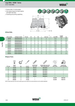 Copy Mills Copy Mills • M200™ Series iC16 • Shell Mills • Double-sided, 12 cutting edges. • Anti-rotation feature for better stability and higher feed rates. • Pocketing and profiling capabilities. Shell Mills coolant order number catalogue number D1 max D1 D D6 L Ap1 max Z max RPM supply kg 5209989 M200D50Z04RN16 50 34 22 42 50 4,0 4 26700 Yes 0,36 5210210 M200D52Z04RN16 52 36 22 42 50 4,0 4 26000 Yes 0,39 5210212 M200D63Z06RN16 63 47 22 49 50 4,0 6 22700 Yes 0,56 5210211 M200D63Z04RN16 63 47 22 49 50 4,0 4 22700 Yes 0,58 5210213 M200D66Z05RN16 66 50 27 60 50 4,0 5 22000 Yes 0,69 5210214 M200D80Z05RN16 80 64 27 60 50 4,0 5 19500 Yes 0,88 5210215 M200D80Z07RN16 80 64 27 60 50 4,0 7 19500 Yes 0,89 5210216 M200D100Z06RN16 100 84 32 78 50 4,0 6 17000 Yes 1,36 5210217 M200D100Z08RN16 100 84 32 78 50 4,0 8 17000 Yes 1,37 5210218 M200D125Z08RN16 125 109 40 90 63 4,0 8 14900 Yes 2,50 Spare Parts insert socket-head socket-head cap screw coolant coolant lock D1 max screw Nm wrench cap screw with coolant groove lock screw screw assembly 50 192.932 4,0 170.026 MS1242 MS1242CG — — 52 MS2260 4,0 170.026 MS1242 MS1242CG — — 63 MS2260 4,0 170.026 MS1242 MS1242CG — — 63 193.343 4,0 170.026 MS1242 MS1242CG — — 66 MS2260 4,0 170.026 MS2038 MS2038CG — — 80 MS2260 4,0 170.026 MS2038 MS2038CG — — 100 MS2260 4,0 170.026 — — KLS32M MS2195C 125 MS2260 4,0 170.026 — — KLS40M MS2187C NOTE: Socket-head cap screw with coolant groove and coolant lock screw assembly must be ordered separately. M36 widia.com