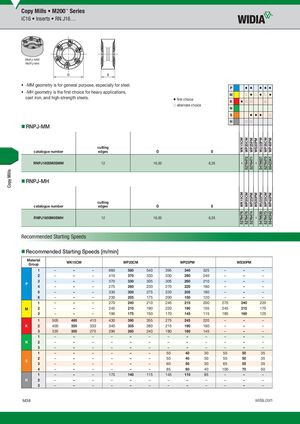 Copy Mills WK15CM–WK15CM5276476 WP20CM5276472WP20CM5276475 WP25PM5276471WP25PM5276474 WS30PM–WS30PM– WU35PM5476637WU35PM5476636 WP35CM5276470WP35CM5276473 WP40PM5542341WP40PM5542342 Copy Mills • M200™ Series iC16 • Inserts • RN.J16… RNPJ-MM RNPJ-MH • -MM geometry is for general purpose, especially for steel. P ⅷ ⅷ ⅷ ⅷ ⅷ • -MH geometry is the first choice for heavy applications, M ࠗ ⅷ ࠗ ⅷ ࠗ ⅷ cast iron, and high-strength steels. ⅷ first choice K ⅷ ࠗ ࠗ ࠗ ࠗ alternate choice N S ⅷ ⅷ ⅷ ࠗ H ࠗ ࠗ RNPJ-MM cutting catalogue number edges D S RNPJ1605M0SMM 12 16,00 6,35 RNPJ-MH cutting catalogue number edges D S RNPJ1605M0SMH 12 16,00 6,35 Recommended Starting Speeds Recommended Starting Speeds [m/min] MaterialGroup WK15CM WP20CM WP25PM WS30PM 1 – – – 660 580 540 395 340 325 – – – 2 – – – 410 370 330 330 290 240 – – – 3 – – – 370 330 305 305 260 210 – – – P 4 – – – 275 260 230 270 220 180 – – – 5 – – – 330 300 275 220 205 180 – – – 6 – – – 230 205 175 200 150 120 – – – 1 – – – 270 240 210 245 215 200 270 240 220 M 2 – – – 245 210 190 220 190 155 245 215 175 3 – – – 190 175 150 170 145 115 185 160 125 1 505 460 410 430 390 355 275 245 220 – – – K 2 400 355 330 340 305 280 215 190 180 – – – 3 335 300 275 290 260 240 180 160 145 – – – 1 – – – – – – – – – – – – N 2 – – – – – – – – – – – – 3 – – – – – – – – – – – – 1 – – – – – – 50 40 30 55 50 35 2 – – – – – – 50 40 30 55 50 35 S 3 – – – – – – 60 50 30 65 55 35 4 – – – – – – 85 60 40 100 70 50 1 – – – 170 140 115 145 110 85 – – – H 2 – – – – – – – – – – – – 3 – – – – – – – – – – – – M38 widia.com