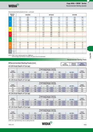 Copy Mills Copy Mills • M200™ Series Recommended Starting Speeds (Recommended Starting Speeds [m/min] — continued) MaterialGroup WU35PM WP35CM WP40PM 1 310 275 260 545 475 445 355 310 295 2 265 230 190 335 305 275 300 260 215 3 240 205 170 305 275 245 275 235 190 P 4 215 180 145 230 210 190 245 205 160 5 180 160 145 310 275 250 205 185 160 6 155 120 95 190 160 130 180 140 110 1 205 180 160 245 220 185 235 205 185 M 2 185 155 130 220 190 170 210 180 150 3 140 120 95 175 155 140 155 140 110 1 – – – 355 320 290 – – – K 2 – – – 280 250 230 – – – 3 – – – 235 210 190 – – – 1 – – – – – – – – – N 2 – – – – – – – – – 3 – – – – – – – – – 1 40 35 30 – – – 50 40 35 2 40 35 30 – – – 50 40 35 S 3 55 40 30 – – – 60 50 35 4 70 55 35 80 60 40 80 60 40 1 – – – – – – – – – H 2 – – – – – – – – – 3 – – – – – – – – – NOTE: FIRST choice starting speeds are in bold type. As the average chip thickness increases, the speed should be decreased. Recommended Starting Feeds Recommended Starting Feeds [mm] Light General Heavy Machining Purpose Machining At 8,00 Axial Depth of Cut (ap) Programmed Feed per Tooth (fz) as a % of Radial Depth of Cut (ae) Insert Insert Geometry 5% 10% 20% 30% 40–100% Geometry ML 0,12 0,37 0,48 0,09 0,27 0,35 0,07 0,20 0,26 0,06 0,17 0,23 0,05 0,16 0,21 ML MM 0,28 0,70 0,81 0,21 0,50 0,58 0,15 0,38 0,44 0,13 0,33 0,38 0,12 0,30 0,35 MM MH 0,53 0,70 1,17 0,38 0,50 0,84 0,29 0,38 0,63 0,25 0,33 0,55 0,23 0,30 0,50 MH At 4,00 Axial Depth of Cut (ap) Programmed Feed per Tooth (fz) as a % of Radial Depth of Cut (ae) Insert Insert Geometry 5% 10% 20% 30% 40–100% Geometry ML 0,14 0,43 0,56 0,10 0,31 0,40 0,08 0,23 0,30 0,07 0,20 0,26 0,06 0,18 0,24 ML MM 0,33 0,81 0,94 0,24 0,58 0,67 0,18 0,43 0,50 0,16 0,38 0,44 0,14 0,35 0,40 MM MH 0,62 0,81 1,36 0,44 0,58 0,97 0,33 0,43 0,72 0,29 0,38 0,63 0,27 0,35 0,58 MH At 2,00 Axial Depth of Cut (ap) Programmed Feed per Tooth (fz) as a % of Radial Depth of Cut (ae) Insert Insert Geometry 5% 10% 20% 30% 40–100% Geometry ML 0,19 0,56 0,73 0,14 0,40 0,53 0,10 0,30 0,40 0,09 0,26 0,34 0,08 0,24 0,32 ML MM 0,43 1,06 1,24 0,31 0,76 0,89 0,23 0,57 0,66 0,20 0,50 0,57 0,19 0,45 0,53 MM MH 0,81 1,06 1,79 0,58 0,76 1,28 0,44 0,57 0,95 0,38 0,50 0,83 0,35 0,45 0,76 MH At 1,00 Axial Depth of Cut (ap) Programmed Feed per Tooth (fz) as a % of Radial Depth of Cut (ae) Insert Insert Geometry 5% 10% 20% 30% 40–100% Geometry ML 0,26 0,77 1,01 0,19 0,55 0,73 0,14 0,41 0,54 0,12 0,36 0,47 0,11 0,33 0,43 ML MM 0,59 1,46 1,70 0,43 1,04 1,21 0,32 0,78 0,90 0,28 0,68 0,79 0,25 0,62 0,72 MM MH 1,11 1,46 2,48 0,80 1,04 1,75 0,60 0,78 1,30 0,52 0,68 1,13 0,48 0,62 1,03 MH NOTE: Use “Light Machining” value as starting feed rate. widia.com M39