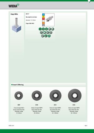 Copy Mills M170™ P Max depth of cut: 8mm M K Diameter: 12–125mm Pages: M42–M70 S H Insert Offering iC07 iC10 iC12 iC16 7mm iC insert RD.X 10mm iC insert RDPX 12mm iC insert RDPX 16mm iC insert RDPX Up to 3,5mm Ap max. Up to 5mm Ap max. Up to 6mm Ap max. Up to 8mm Ap max. Diameter range Diameter range Diameter range Diameter range 12–35mm 20–52mm 24–100mm 32–125mm widia.com M41