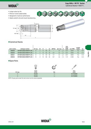 Copy Mills Copy Mills • M170™ Series Cylindrical Shanks • RD07T1.. • Longer cutter tool life. • Premium nickel-coated bodies. • Designed for maximum performance. • Ideally suited for die and mould manufacturing. Cylindrical Shanks max ramp coolant order number catalogue number D1 max D1 D L L2 BHTCA Ap1 max Z angle max RPM supply kg 3935339 M170D012Z02A12RD07TL100 12 5 12 100 20 — 3,5 2 22.0° 26200 Yes 0,07 3935340 M170D012Z02A16RD07TL120 12 5 16 120 60 2.0° 3,5 2 22.0° 26200 Yes 0,14 3935341 M170D012Z02A16RD07TL140 12 5 16 140 80 1.5° 3,5 2 22.0° 26200 Yes 0,16 3935342 M170D015Z03A16RD07TL130 15 8 16 130 60 0.5° 3,5 3 11.0° 21200 Yes 0,13 Spare Parts insert Torx D1 max screw Nm driver 12 193.364 1,0 12147549000 15 193.364 1,0 12147549000 NOTE: All spare parts except the insert screws must be ordered separately. widia.com M43
