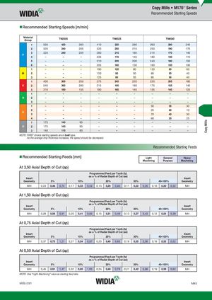 Copy Mills Copy Mills • M170™ Series Recommended Starting Speeds Recommended Starting Speeds [m/min] MaterialGroup TN2505 TN6525 TN6540 1 550 420 360 410 320 280 360 280 240 2 320 240 205 320 250 215 250 190 170 3 320 240 205 280 215 185 215 170 140 P 4 – – – 235 170 145 180 130 110 5 – – – 310 235 200 240 180 150 6 – – – 205 160 130 160 120 100 1 – – – 190 120 80 130 80 60 M 2 – – – 120 80 50 80 50 40 3 – – – 125 80 55 85 50 40 1 400 300 250 275 245 220 220 205 180 K 2 540 365 280 215 190 180 175 155 140 3 310 190 155 180 160 145 155 145 125 1 – – – – – – – – – N 2 – – – – – – – – – 3 – – – – – – – – – 1 – – – – – – 50 35 30 2 – – – – – – 25 20 10 S 3 – – – – – – 70 40 30 4 – – – – – – 60 30 25 1 175 140 95 – – – – – – H 2 175 140 95 – – – – – – 3 140 115 80 – – – – – – NOTE: FIRST choice starting speeds are in bold type. As the average chip thickness increases, the speed should be decreased. Recommended Starting Feeds Recommended Starting Feeds [mm] Light General Heavy Machining Purpose Machining At 3,50 Axial Depth of Cut (ap) Programmed Feed per Tooth (fz) as a % of Radial Depth of Cut (ae) Insert Insert Geometry 5% 10% 20% 30% 40–100% Geometry MH 0,23 0,46 0,74 0,17 0,33 0,54 0,13 0,25 0,40 0,11 0,22 0,35 0,10 0,20 0,32 MH At 1,50 Axial Depth of Cut (ap) Programmed Feed per Tooth (fz) as a % of Radial Depth of Cut (ae) Insert Insert Geometry 5% 10% 20% 30% 40–100% Geometry MH 0,28 0,56 0,91 0,20 0,41 0,65 0,15 0,31 0,49 0,13 0,27 0,43 0,12 0,24 0,39 MH At 0,75 Axial Depth of Cut (ap) Programmed Feed per Tooth (fz) as a % of Radial Depth of Cut (ae) Insert Insert Geometry 5% 10% 20% 30% 40–100% Geometry MH 0,37 0,75 1,21 0,27 0,54 0,87 0,20 0,40 0,65 0,18 0,35 0,56 0,16 0,32 0,52 MH At 0,50 Axial Depth of Cut (ap) Programmed Feed per Tooth (fz) as a % of Radial Depth of Cut (ae) Insert Insert Geometry 5% 10% 20% 30% 40–100% Geometry MH 0,45 0,91 1,47 0,32 0,65 1,05 0,24 0,49 0,78 0,21 0,42 0,68 0,19 0,39 0,62 MH NOTE: Use “Light Machining” value as starting feed rate. widia.com M45