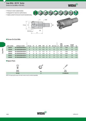 Copy Mills Copy Mills • M170™ Series Screw-On End Mills • RD1003.. • Premium nickel-coated bodies. • Designed for maximum performance. • Ideally suited for die and mould manufacturing. Screw-On End Mills max ramp coolant order number catalogue number D1 max D1 D DPM G3X L2 WF Ap1 max Z angle max RPM supply kg 3934647 M170D020Z02M10RD10 20 10 18 10,5 M10 30 15 5,0 2 20.0° 15900 Yes 0,06 3934648 M170D025Z02M12RD10 25 15 21 12,5 M12 35 19 5,0 2 8.0° 12800 Yes 0,10 3934649 M170D025Z03M12RD10 25 15 21 12,5 M12 35 19 5,0 3 8.0° 12800 Yes 0,10 3934650 M170D030Z04M16RD10 30 20 29 17,0 M16 43 22 5,0 4 10.0° 10600 Yes 0,24 3934651 M170D035Z05M16RD10 35 25 29 17,0 M16 45 22 5,0 5 8.5° 9100 Yes 0,23 3934652 M170D042Z06M16RD10 42 32 29 17,0 M16 45 22 5,0 6 6.0° 7800 Yes 0,28 Spare Parts insert Torx screw Nm driver 193.342 3,5 12148082400 NOTE: All spare parts except the insert screws must be ordered separately. M52 widia.com