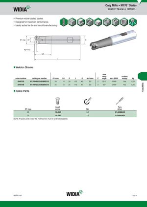 Copy Mills Copy Mills • M170™ Series Weldon® Shanks • RD1003.. • Premium nickel-coated bodies. • Designed for maximum performance. • Ideally suited for die and mould manufacturing. Weldon Shanks max ramp coolant order number catalogue number D1 max D1 D L L2 Ap1 max Z angle max RPM supply kg 3940703 M170D020Z02B20RD10 20 10 20 110 40 5,0 2 20.0° 15900 Yes 0,24 3940708 M170D025Z03B25RD10 25 15 25 110 40 5,0 3 9.0° 12900 Yes 0,35 Spare Parts insert Torx D1 max screw Nm driver 20 193.342 3,5 12148082400 25 193.342 3,5 12148082400 NOTE: All spare parts except the insert screws must be ordered separately. widia.com M53