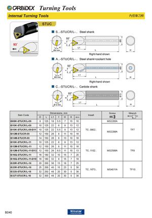 Turning Tools Internal Turning Tools 內徑車刀桿 STUC Dimensions, mm Screw Wrench Item Code Insert D L L1 f H K dmin IS08K-STUCR/L-09 8 125 18 5.5 7 15 10 MS2205A IS10K-STUCR/L-09 10 125 22 6 9 13 12 IS10K-STUCR/L-09-D11 10 125 22 5.5 9 13 12 TC..0902.. TF7 MS2206A IS12M-STUCR-09 12 150 26 8 11 10 16 IS14M-STUCR-09 14 150 26 8 13 10 16 IS10K-STUCR/L-11 10 125 22 6 9 13 12 IS12M-STUCR/L-11 12 150 26 8 11 10 16 IS12M-STUCR/L-11-D13 12 150 26 6.5 11 10 13 TC..1102.. MS2506A TF9 IS16Q-STUCR/L-11 16 180 32 10 15 7 20 IS16Q-STUCR/L-11-D18 16 180 32 9 15 7 18 IS20R-STUCR/L-16 20 200 36 13 18 7 25 IS25R-STUCR/L-16 25 200 40 15 23 5 30 TC..16T3.. MS4011A TF15 IS32S-STUCR/L-16 32 250 48 20 30 5 38 IS32T-STUCR/L-16 32 300 48 20 30 5 38 B040