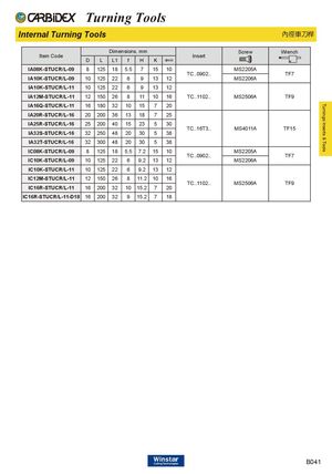 Turnings Inserts & Tools Turning Tools Internal Turning Tools 內徑車刀桿 Dimensions, mm Screw Wrench Item Code Insert D L L1 f H K dmin IA08K-STUCR/L-09 8 125 18 5.5 7 15 10 MS2205A TC..0902.. TF7 IA10K-STUCR/L-09 10 125 22 6 9 13 12 MS2206A IA10K-STUCR/L-11 10 125 22 6 9 13 12 IA12M-STUCR/L-11 12 150 26 8 11 10 16 TC..1102.. MS2506A TF9 IA16Q-STUCR/L-11 16 180 32 10 15 7 20 IA20R-STUCR/L-16 20 200 36 13 18 7 25 IA25R-STUCR/L-16 25 200 40 15 23 5 30 TC..16T3.. MS4011A TF15 IA32S-STUCR/L-16 32 250 48 20 30 5 38 IA32T-STUCR/L-16 32 300 48 20 30 5 38 IC08K-STUCR/L-09 8 125 18 5.5 7.2 15 10 MS2205A TC..0902.. TF7 IC10K-STUCR/L-09 10 125 22 6 9.2 13 12 MS2206A IC10K-STUCR/L-11 10 125 22 6 9.2 13 12 IC12M-STUCR/L-11 12 150 26 8 11.2 10 16 TC..1102.. MS2506A TF9 IC16R-STUCR/L-11 16 200 32 10 15.2 7 20 IC16R-STUCR/L-11-D18 16 200 32 9 15.2 7 18 B041