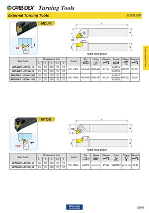Turning Inserts & Tools Turning Tools External Turning Tools 外徑車刀桿 MDJN Dimensions, mm Pin Shim Wrench Screw Clamp Wrench Item Code Insert H B L L1 f IMDJNR/L-2020K-15 20 20 125 20 25 MS625 DN..1504.. MLP46L DMS442 PL25 MC622 PL30 IMDJNR/L-2525M-15 25 25 150 25 32 MS630 IMDJNR/L-2020K-1506 20 20 125 20 25 MS625 DN..1506.. MLP46L DMS432 PL25 MC622 PL30 IMDJNR/L-2525M-1506 25 25 150 25 32 MS630 MTQN Dimensions, mm Pin Screw Wrench Shim Clamp Wrench Item Code Insert H B L L1 f IMTQNR/L-2020K-16 20 20 125 20 25 TN..1604.. MCP3 MCS3S-11 PL30 TWS322 MCW3-P40 PL40 IMTQNR/L-2525K-16 25 25 150 25 32 B049