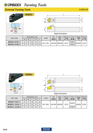 Turning Tools External Turning Tools 外徑車刀桿 MSDN Dimensions, mm Pin Shim Wrench Screw Clamp Wrench Item Code Insert H B L L1 f IMSDNN-2020K-12 20 20 125 20 10 MS625 SN..1204.. MLP46 SMS432 PL25 MC620 PL30 IMSDNN-2525M-12 25 25 150 25 12.5 MS630 MSSN Dimensions, mm Pin Shim Wrench Screw Clamp Wrench Item Code Insert H B L L1 f IMSSNR-1616K-12 16 16 125 16 20 MS625 IMSSNR/L-2020K-12 20 20 125 20 25 SN..1204.. MLP46 SMS432 PL25 MC620 PL30 IMSSNR/L-2525M-12 25 25 150 25 32 MS630 B050