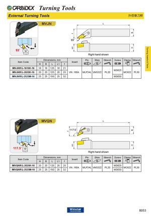 Turning Inserts & Tools Turning Tools External Turning Tools 外徑車刀桿 MVJN Dimensions, mm Pin Shim Wrench Screw Clamp Wrench Item Code Insert H B L L1 f IMVJNR/L-1616K-16 16 16 125 16 21 MS625 IMVJNR/L-2020K-16 20 20 125 20 25 VN..1604.. MLP34L VMS322 PL20 MC622 PL30 IMVJNR/L-2525M-16 25 25 150 25 32 MS630 MVQN Dimensions, mm Pin Shim Wrench Screw Clamp Wrench Item Code Insert H B L L1 f IMVQNR/L-2020K-16 20 20 125 20 25 MS625 VN..1604.. MLP34L VMS322 PL20 MC622 PL30 IMVQNR/L-2525M-16 25 25 150 25 32 MS630 B053